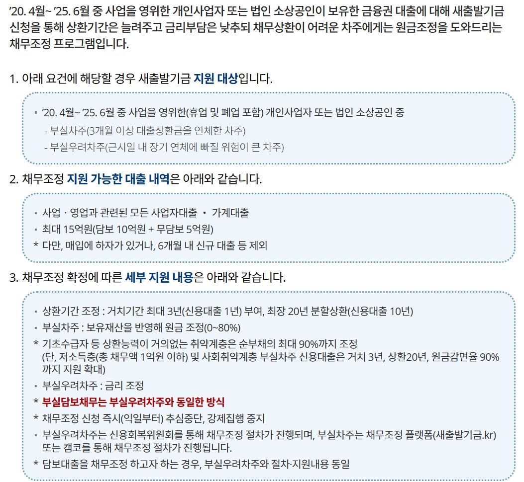 - 협약 기관: 새출발기금은 협약된 금융회사의 채무만 조정 가능하며, 대부분의 시중은행, 저축은행, 카드사 등이 포함됩니다.