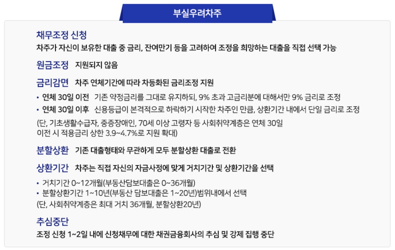 - 금리 인하: 부실우려차주의 경우 연체 기간과 상관없이 기존 약정 금리를 9% 상한으로 조정합니다. 또한, 성실하게 상환하면 점진적으로 금리를 낮춰 최종적으로는 3~4%대의 낮은 금리를 적용받을 수 있습니다.