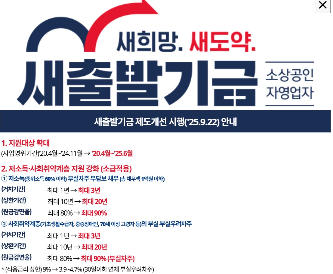 구분 새출발기금 핵심 내용 핵심 혜택 원금 최대 90% 감면, 이자율 인하(3~4%대), 최장 20년 분할 상환 채무 한도 총 15억 원 (담보 10억 + 무담보 5억) 신청 방법 온라인: 새출발기금.kr 공식 홈페이지
