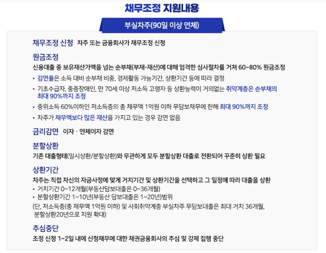 - 원금 조정 (최대 90%): 90일 이상 연체된 '부실차주'를 대상으로 하며, 보유 재산을 넘어서는 순부채에 대해 60~80%의 원금 감면을 기본으로 합니다. 특히 기초생활수급자, 중증장애인 등 취약계층은 최대 90%까지 원금을 조정받을 수 있습니다.