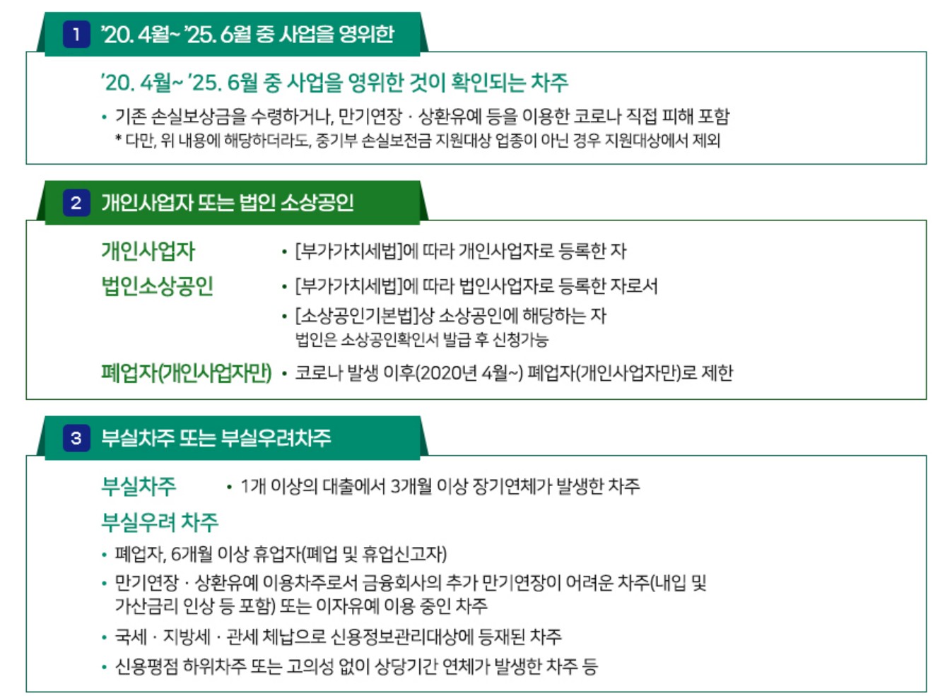 - 코로나19 피해: 정부의 방역 조치를 이행한 사업자로서, 매출 감소 등 피해가 객관적으로 인정되는 경우