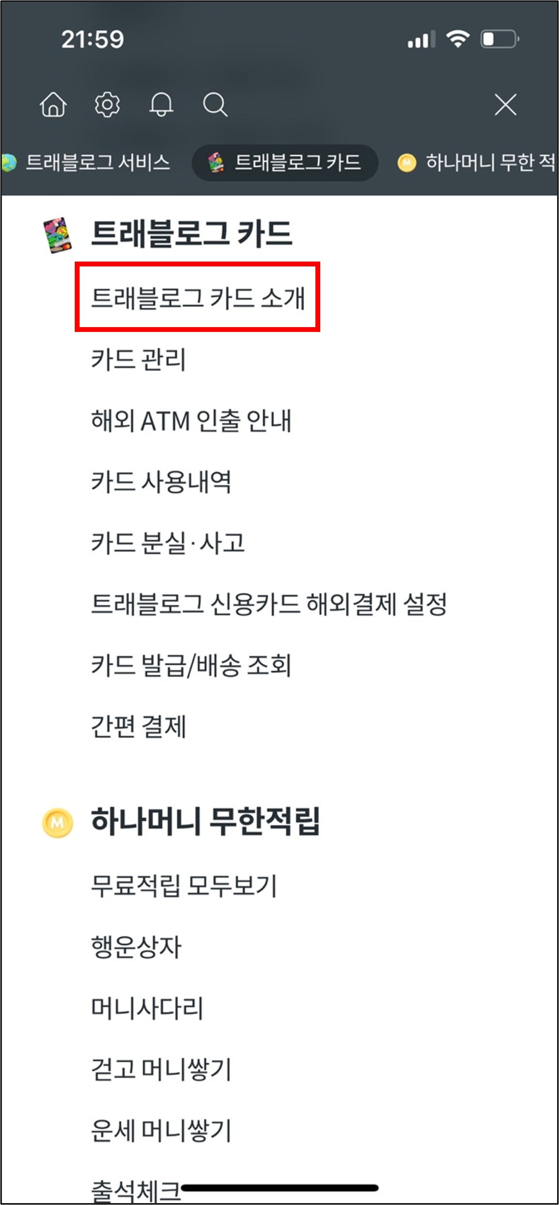 - 스크롤 내려 '트래블로그 카드 소개' 버튼 찾아서 누르기