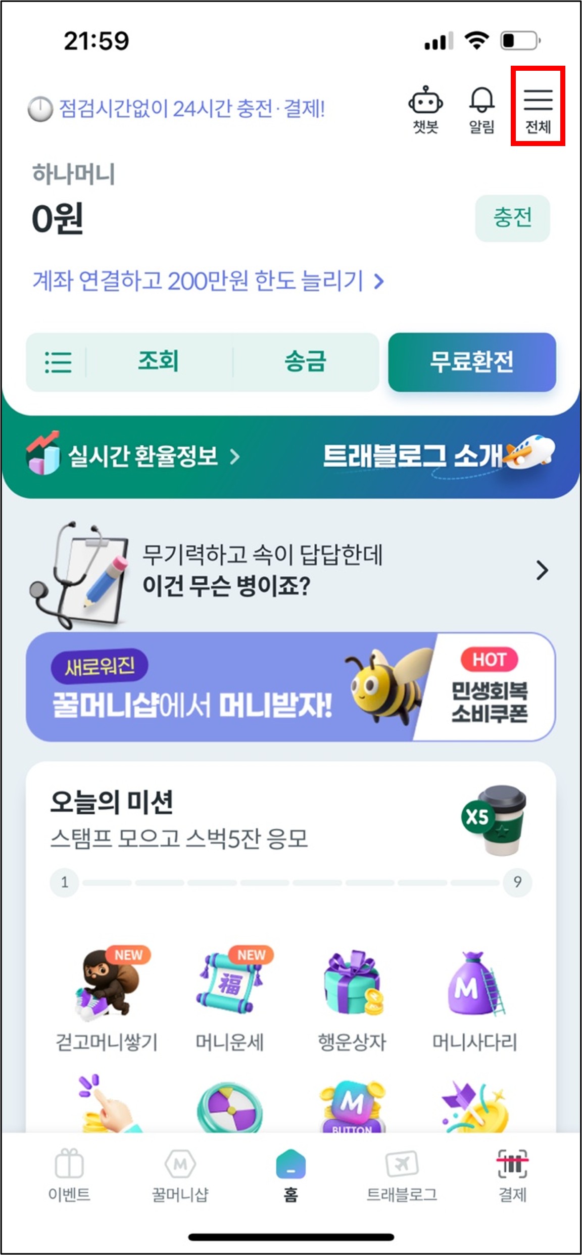 - 하나머니 어플에서 '전체' 누르기 (우측 상단)
