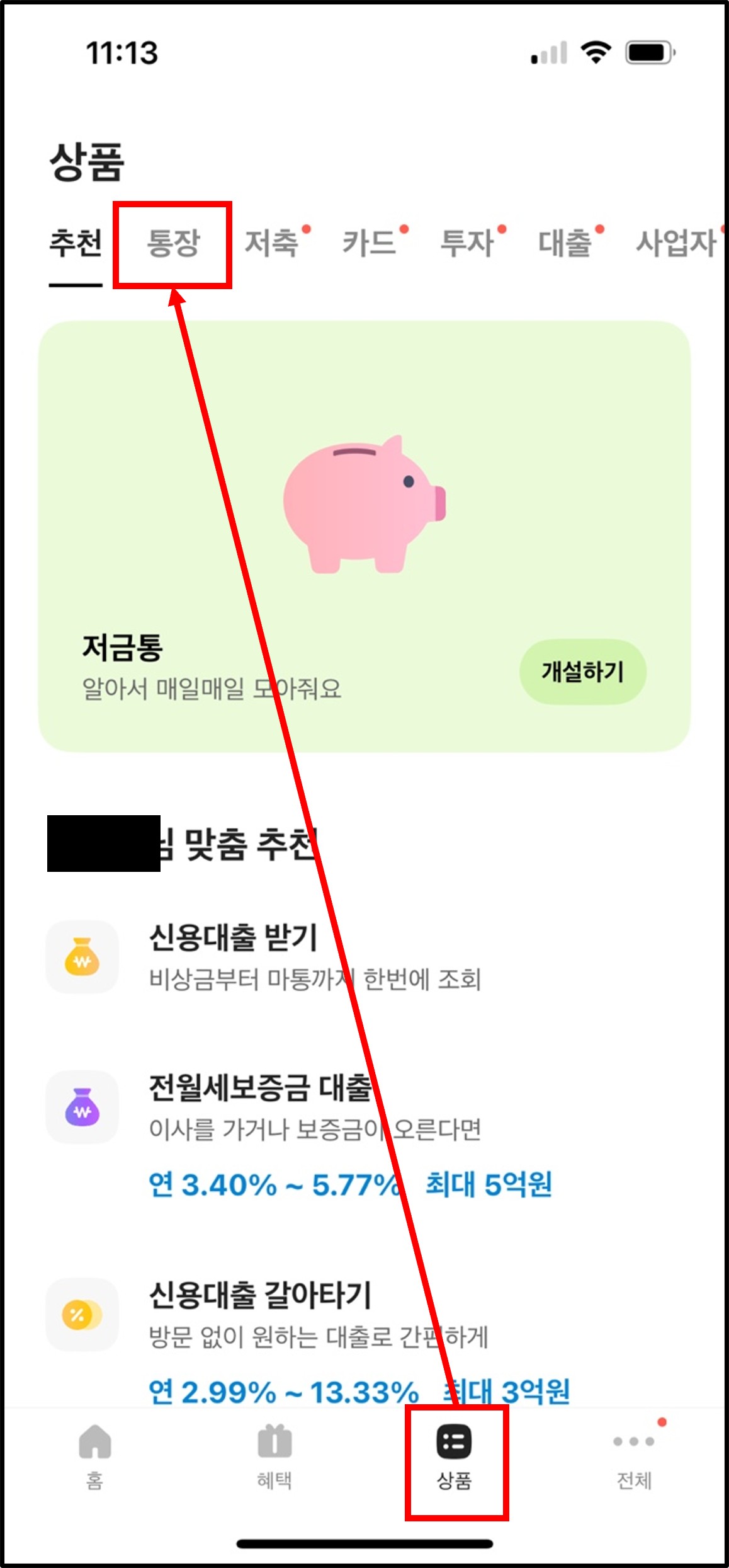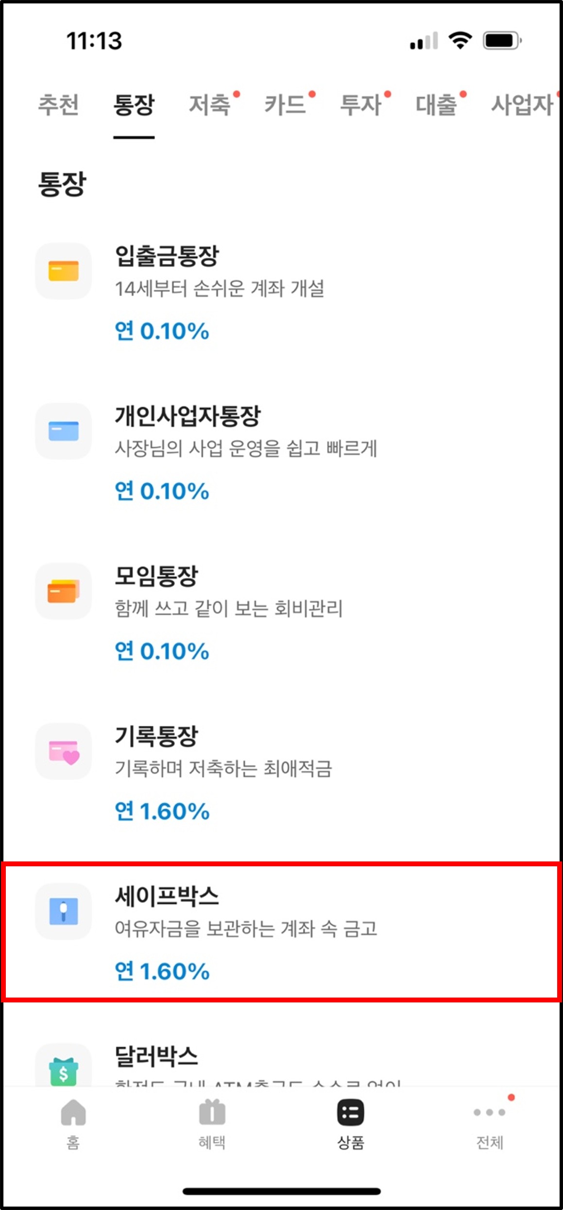 - '상품' 메뉴에서 상단 '통장'이라는 메뉴 클릭