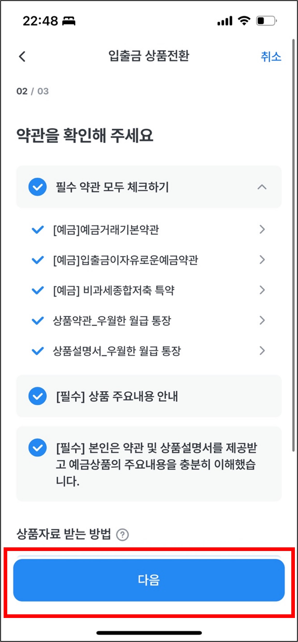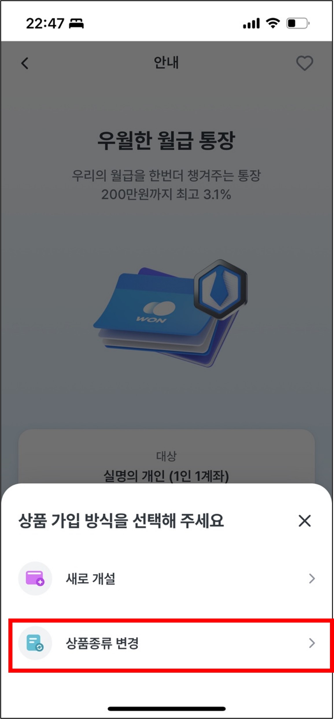 - '상품 가입' 버튼 누르고 새로 개설 또는 상품종류 변경