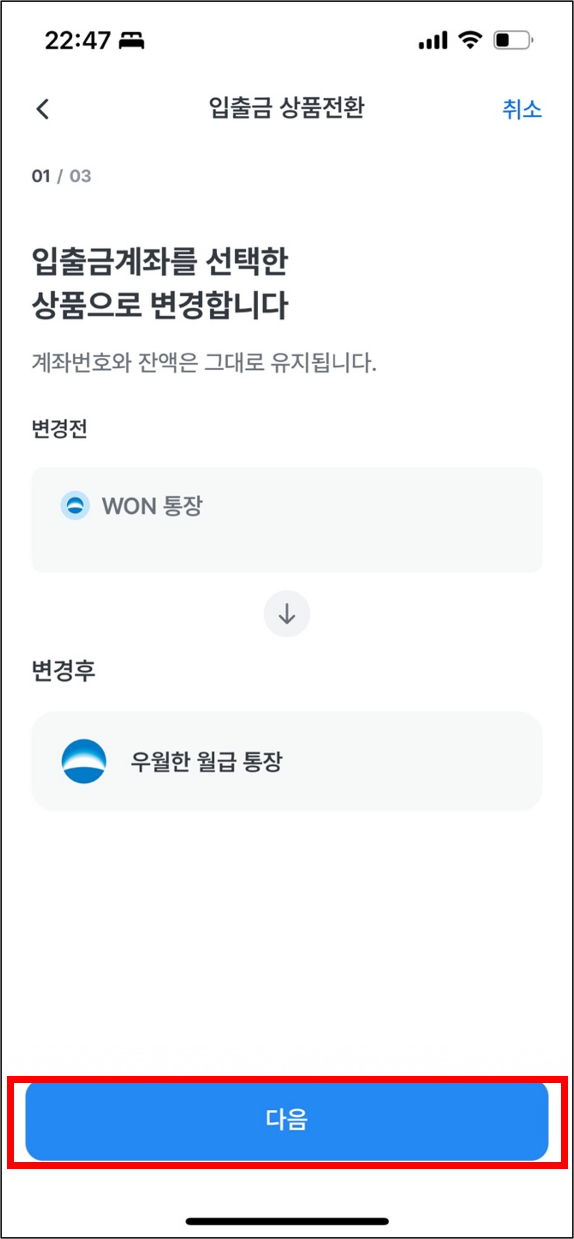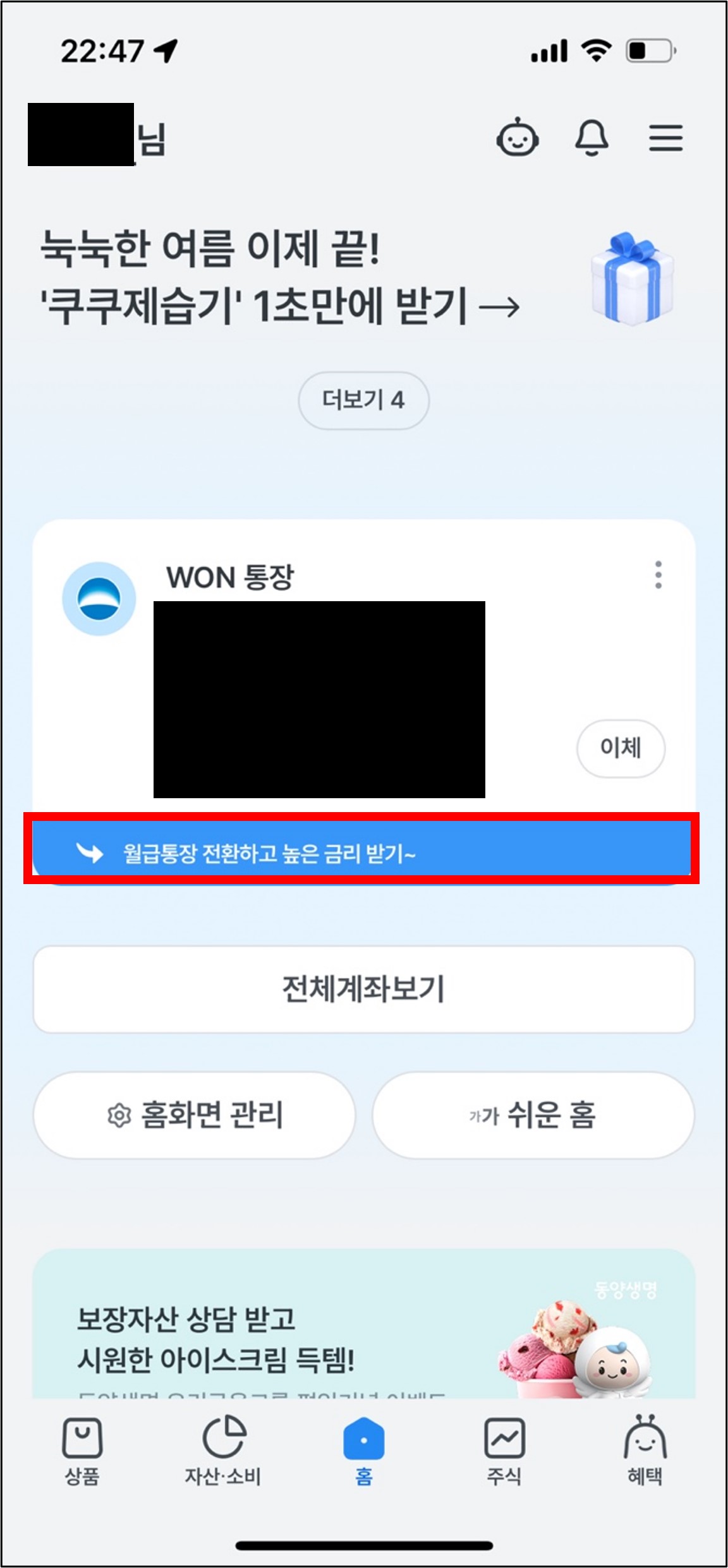 - 메뉴에서 '우월한 월급 통장' 검색 또는 기존 통장 '월급통장 전환'
