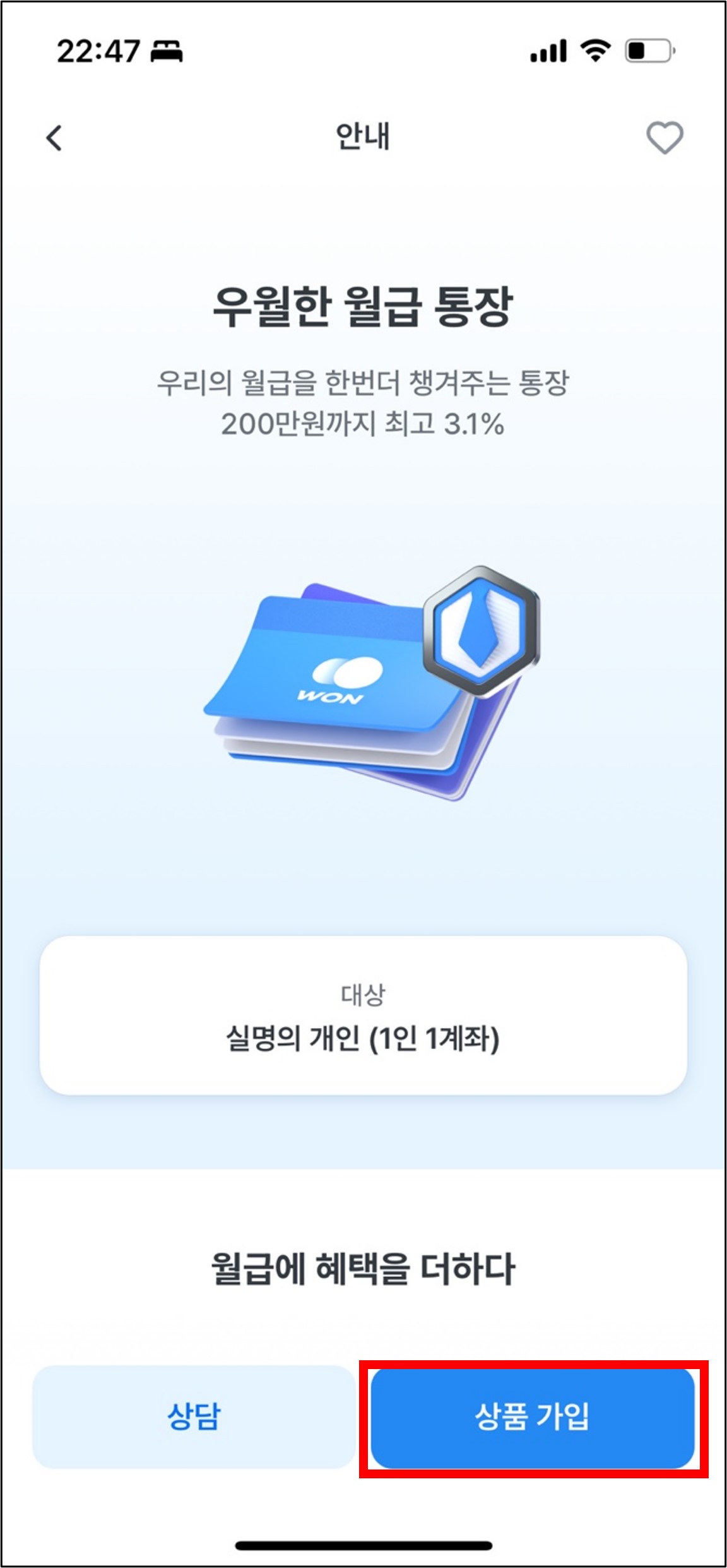우리은행 우월한 월급통장 가입은 원(WON) 뱅킹 앱에서 간단하게 가능합니다.