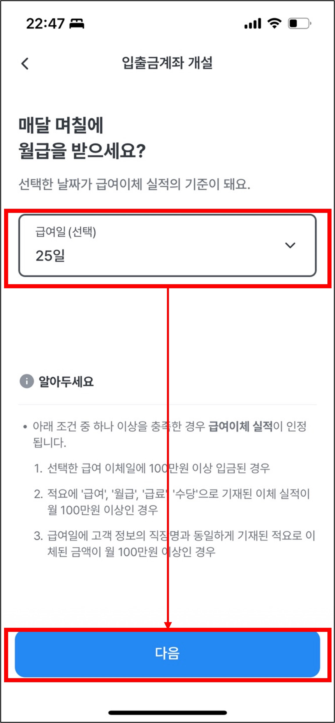 - 급여일 지정: 통장 개설 시 본인의 급여일을 정확하게 지정해야 급여이체 실적을 인정받기 수월합니다.