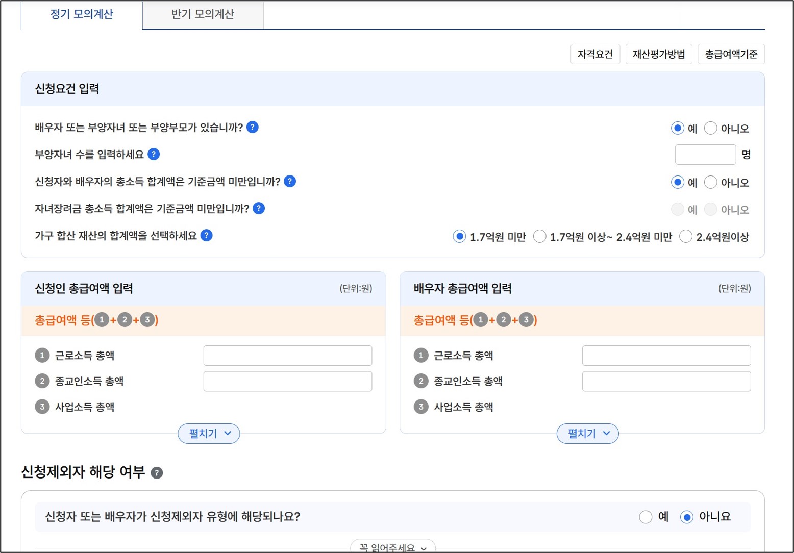 여기서 재산은 주택, 토지, 자동차, 예금, 전세금 등 가구원 전체의 재산을 모두 합산하여 계산합니다.