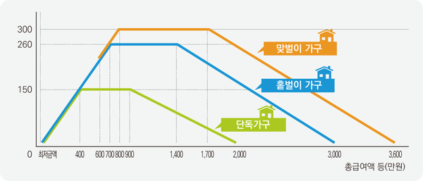 구분 단독 가구 홑벌이 가구 맞벌이 가구 최대 지급액 165만 원 285만 원 330만 원 총소득 요건 2,200만 원 미만 3,200만 원 미만 3,800만 원 미만 재산 요건 가구원 재산 합계액 2억 4천만 원 미만 가구원 재산 합계액 2억 4천만 원 미만 가구원 재산 합계액 2억 4천만 원 미만 이 모든 경우의 재산 요건은 가구원 재산 합계액 2억 4천만 원 미만입니다.