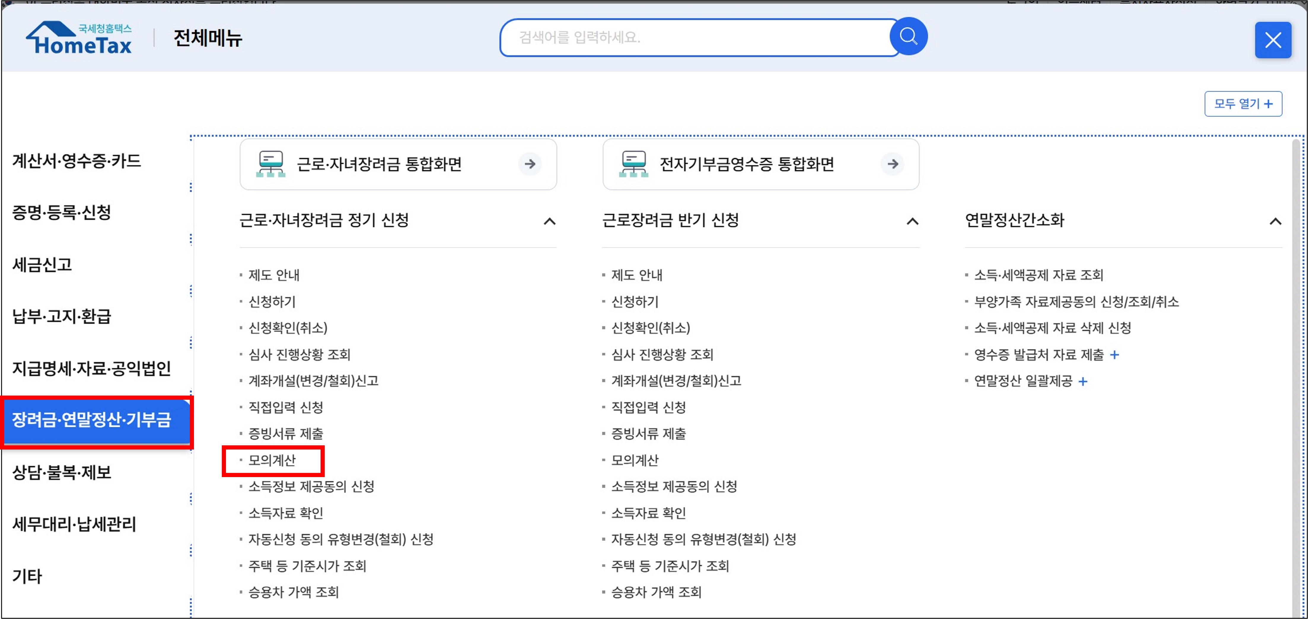 - '장려금, 연말정산, 기부금' 섹션에서 '모의계산' 선택