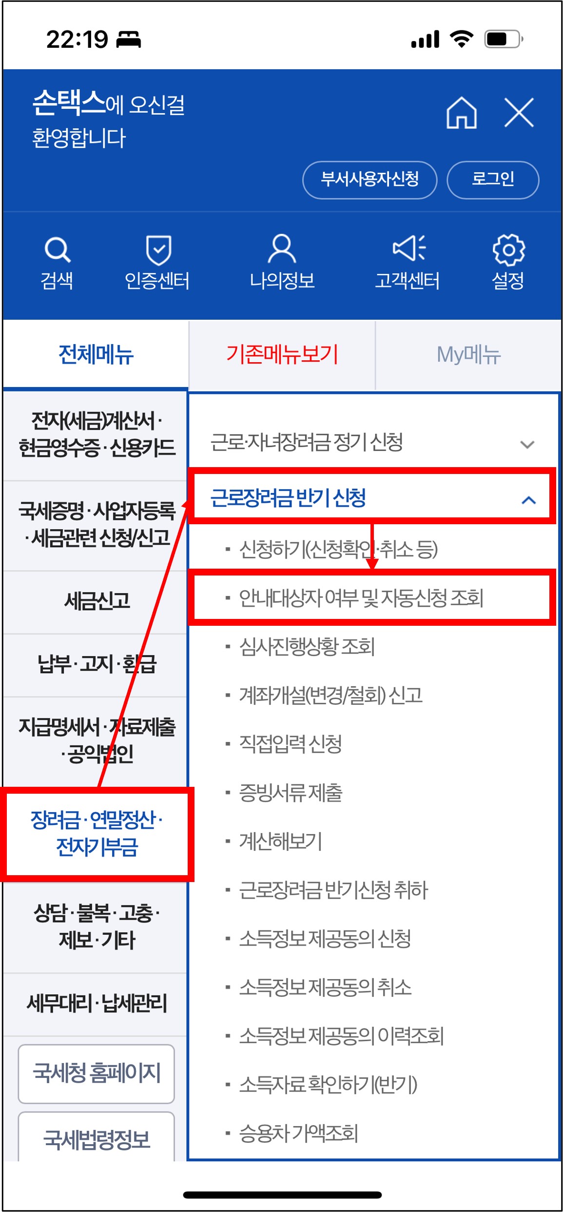 - '근로장려금 반기 신청'에서 '안내대상자 여부 및 자동신청 조회' 메뉴 클릭