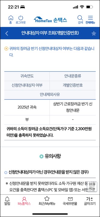 만약 근로장려금 조회 결과 안내 대상이 아님이라고 나와도 소득, 재산 요건을 충족한다면 신청을 한 번 시도해볼 법 합니다.