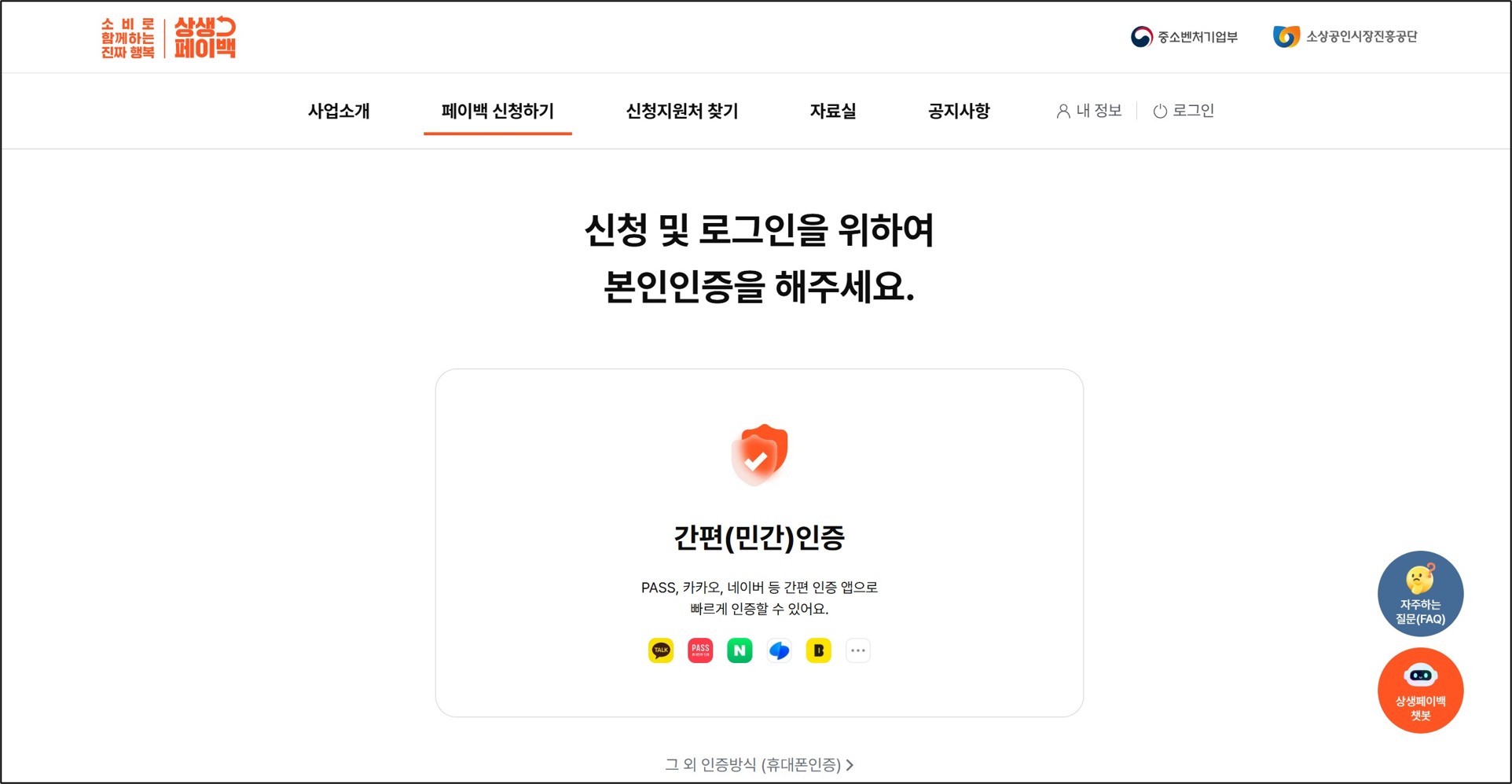 '상생페이백.kr'에 접속하면 다음과 같은 화면을 보실 수 있어요.